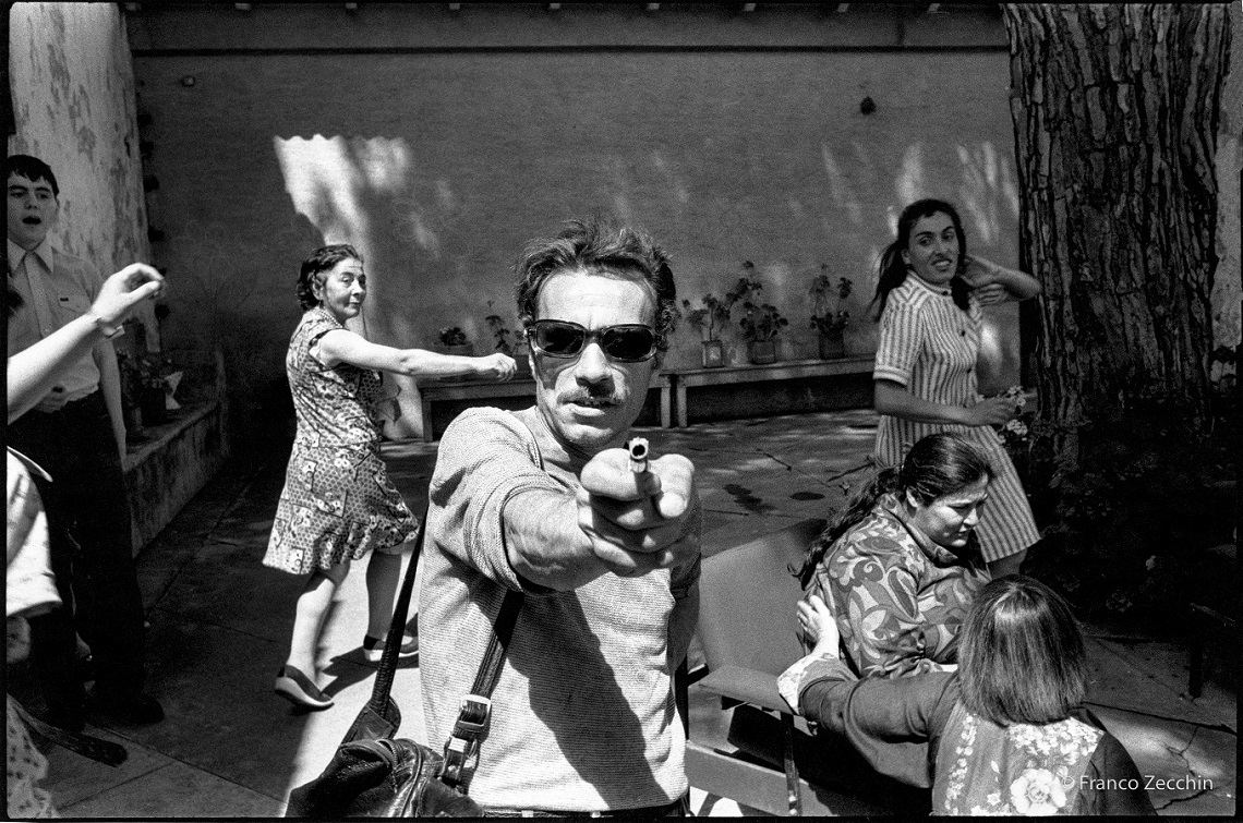 Quegli occhi di bambini sono uno dei tratti senza tempo della città su cui si ferma lo sguardo commosso dei fotografi. Ma l’altro universale palermitano è l’illegalità, il nemico interno capace di colpire con feroce spregiudicatezza. Letizia Battaglia intona la voce della denuncia, si politicizza con determinazione, mostra immagini crude con ostinata verità. In mezzo alla vita pulsante dei quartieri e dei mercati la cronaca racconta di attentati sanguinari e di arresti mafiosi. Zecchin ritrae la collega pronta a fotografare proprio sul luogo di un omicidio. In uno scatto di Lia Pasqualino si vede ancora, sempre immersa nella vita dei suoi paesani, mentre gioca con un degente dell’ospedale psichiatrico, altro toccante micromondo incastonato nel cosmo palermitano.
